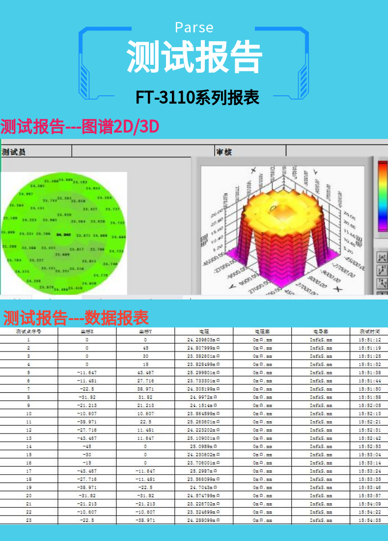 四探針電阻率/方阻測試儀大體分類為,全自動類型和半自動類型;全自動類型成本高,精度和穩定性要求也高,如全自動四探針測試儀一般采用MAP地圖圖譜方式來描述整體樣品均勻性及方阻和電阻率數據,也就是應用2D和3D 圖.